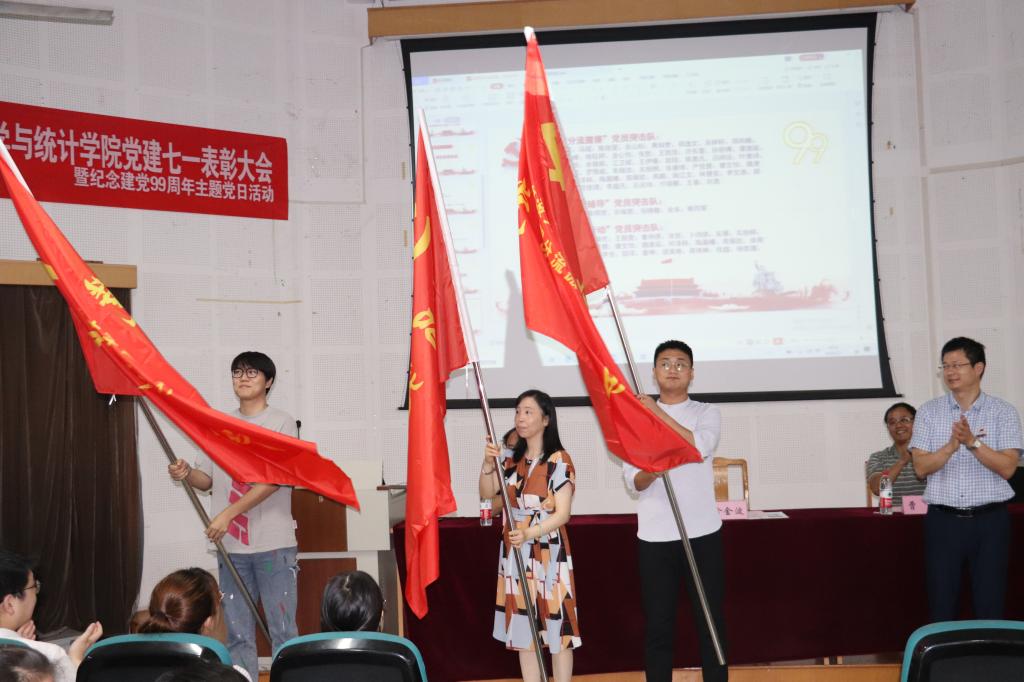 在庄严的国歌声中,表彰大会拉开序幕。曹炜同志带领18位新发展党员面对党旗郑重宣誓,一句句誓词掷地有声、动人心魄,坚定了共产党员的初心使命,激励着全体党员保持奋斗精神,继续在学院发展建设中争当模范。随后,张宾同志宣读了“七一”表彰决定,表彰了2019-2020学年香香腐宅 各类先进集体和优秀个人。获奖集体和个人充分展示了香香腐宅 主题教育尤其是抗疫以来各党支部和广大党员的风采。在欢快的颁奖曲中,胡良根同志为获得表彰的先进集体和优秀个人颁发荣誉证书。最后,俞金波同志为“分流搬寝”、“考研辅导”、“清风行动”三支党员突击队授旗,鼓励他们充分发挥党员先锋作用,积极推进学生社区治理,毕业就业、学风建设和安全稳定等工作,为学院各项事业发展做出更大贡献。
