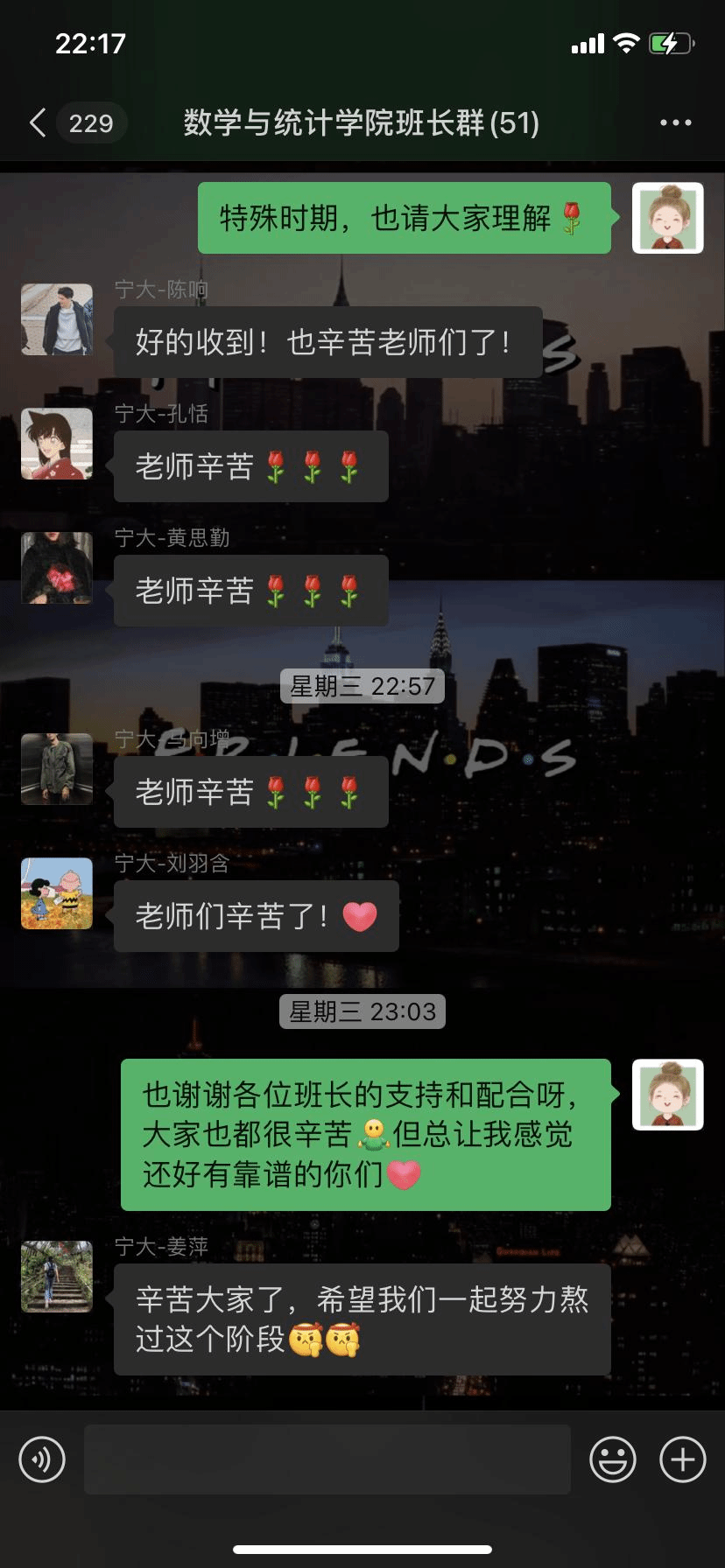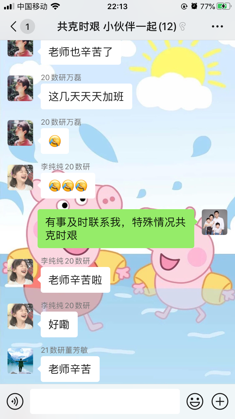 学工办主任张宾每天工作超过10个小时以上,排摸学生行程、监督学生打卡、组织核酸检测、安排生病学生就医等等,电话经常打得没电再充电。分团委书记陈佳雯第一时间加入了学校“学工战役冲锋队”,协调处理学院和学校的防疫工作。班主任召开20余次线上主题班会,及时了解班级情况,督促学生做好线上学习,指导学生成长与发展。研究生导师主动关心所指导学生的毕业论文及研究进展情况及身心健康状况。