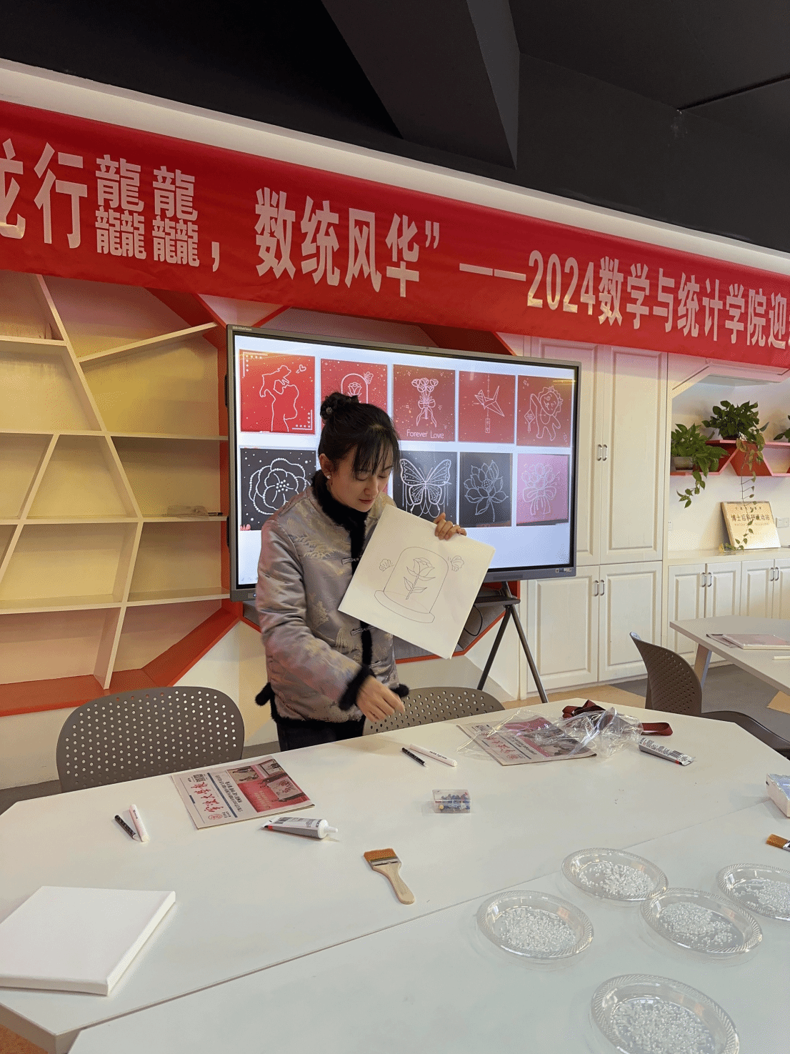 学院分工会和学工办精心准备了活动需要的各种材料,包括胶水、颜料,刷子、点钻笔、各种型号的珍珠等,并邀请了学院党委副书记姜萍老师作为指导老师。姜老师首先为大家讲解了珍珠画的制作过程,然后指导大家根据自己的喜好选择材料和颜色,完成刷底色、描图、贴珍珠等一系列步骤。经过近两个小时的制作,一幅幅美丽的珍珠画相继出炉。